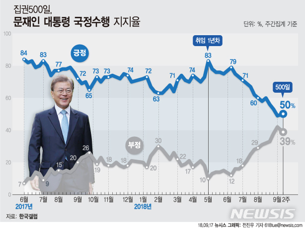 문재인 정부가 고용위기 해법을 놓고 고민하는 사이 끝모를 지지율 추락도 감내해야 했다. 지난 5월까지 80%대의 탄탄대로를 달리던 지지율은 50%선 방어에도 힘에 부친 상황에 놓였다. 급기야 49%까지 떨어졌다(갤럽 9월1주차·신뢰수준 95%·표본오차 ±3.1%p).