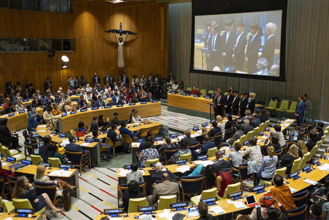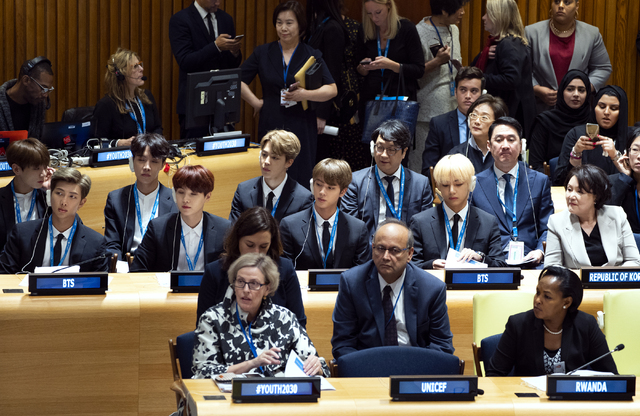 그룹 '방탄소년단'(BTS)이 UN총회 무대에 올랐다. 방탄소년단은 24일 오후(현지시간) 뉴욕 UN본부 신탁통치이사회 회의장에서 열린 UNICEF(유엔아동기금) 청년 어젠다 '제너레이션 언리미티드' 행사에 참석했다.