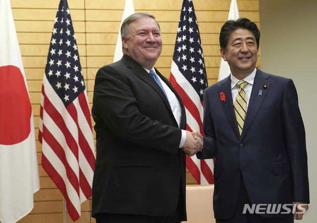 앞서 아베 총리는 폼페이오 장관에게 "방북 전에 일본을 방문해준 점을 높이 평가한다"며 "오늘 북한과 관련, 납치문제, 핵문제에 대해 미일간에 밀접한 조정을 하고 싶다"고 말했다. 아울러 아베 총리는 "지난 유엔총회에서 트럼프 대통령과 유익한 만찬, 회담을 할 수 있었다"며 이는 "견고한 미일 동맹의 모습을 세계에 발신"할 수 있는 기회였다고 강조했다.