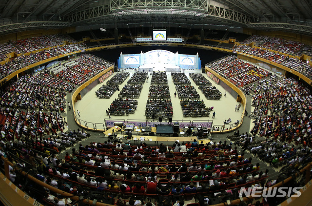 한학자 총재와 문연아 천주평화연합 한국회장, 문훈숙 한국문화재단 이사장, 이기성 가정연합 한국회장, 박주선(바른미래당)·유성엽(민주평화당) 의원 등 2만여명이 참석했다.