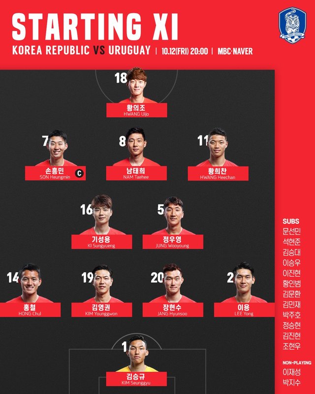 2018 자카르타·팔렘방 아시안게임에서 금메달을 합작했던 세 선수는 우루과이를 상대로 다시 한 번 호흡을 맞춘다. 황의조가 최전방에 포진되고 손흥민과 황희찬이 좌우 측면을 노린다.