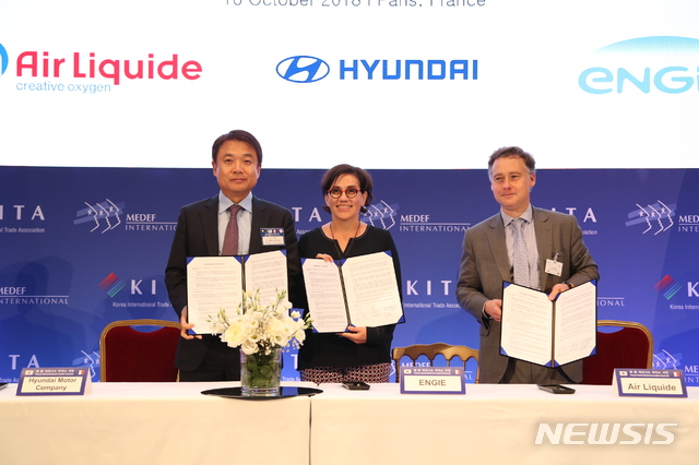 【서울=뉴시스】 박주연 기자 = 현대자동차가 16일(현지시간) 프랑스 더 웨스틴 파리 방돔 호텔에서 프랑스의 세계적 산업용 가스회사 '에어리퀴드', 다국적 에너지기업 '엔지'사와 수소전기차·수소충전소 보급 확대를 위한 양해각서(MOU)를 체결했다.