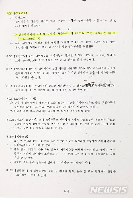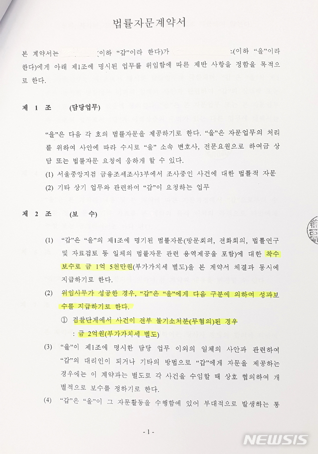 또 길병원과의 계약서의 경우 이름은 '법률자문계약서'인데 '보수' 항목에 "위임사무가 성공한 경우 '갑'은 '을'에게 다음 구분에 의해 성과보수를 지급하기로 한다"면서 "① 검찰단계에서 사건이 전부 불기소처분(무혐의) 된 경우 : 금 2억원(부가가치세 별도)"라고 돼 있다.