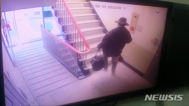 【부산=뉴시스】 하경민 기자 = 부산 사하경찰서는 부산의 한 아파트에서 일가족 4명과 용의자로 추정되는 남성 등 5명이 숨진 채 발견해 수사를 벌이고 있다고 26일 밝혔다.사진은 용의자로 추정되는 남성이 범행도구가 들어 있는 것으로 추정되는 큰 가방을 들고 아파트로 들어가는 모습이 담긴 CCTV영상. 2018.10.26. (사진=부산경찰청 제공)[email protected]