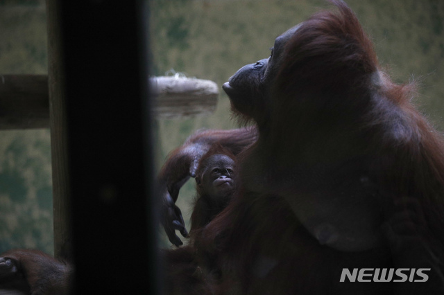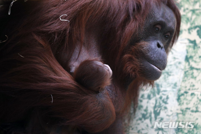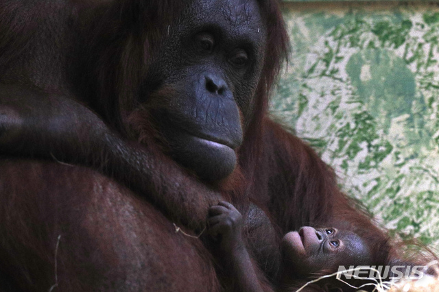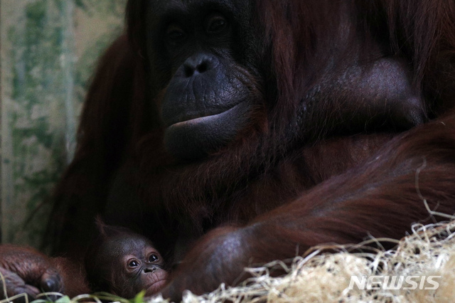26일 인도네시아 자바산 오랑우탄 '세오도라'(30)가 프랑스 파리 식물원에서 갓 태어난 새끼 '자바'(암)를 돌보고 있다. 2005년 이후 13년 만에 이곳에서 태어난 보르네오 오랑우탄이다. 암컷은 대개 14~15세에 첫 출산하며, 수명은 30년 정도다.