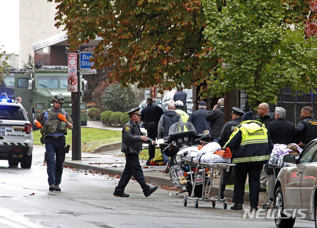 【서울=뉴시스】 오애리 기자 = 미국 펜실베니아주 피츠버그의 스쿼럴 힐에 있는 유대교 예배당에서 27일(현지시간) 일어난 총기 난사 사건으로 인한 사망자가 최소 11명으로 늘었다. 경찰 4명을 포함해 6명의 부상자도 발생했다.