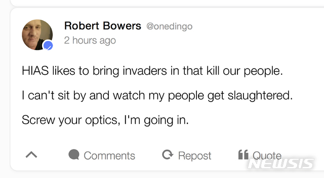 경찰에 따르면, 바우어스는 범행 17일전 HIAS가 난민들을 위해 여는 예배 일정을 포스팅했다. 그 중 한 곳은 이번에서 범행을 저지른 예배당과 가까운 곳이었던 것으로 나타났다.