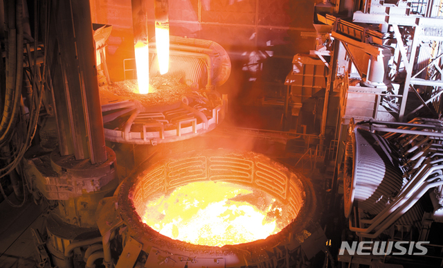 제강공장에 있는 전기로 앞을 지나자 엄청난 굉음과 함께 불꽃이 반짝였다. 고철(철스크랩)을 녹이는 과정에서 나오는 소리다.