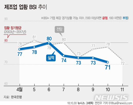 한국은행이 30일 발표한 '10월 기업경기실사지수(BSI) 및 경제심리지수(ESI)'에 따르면 이달 전산업 BSI는 73으로 전월보다 2포인트 하락했다. 지난 5월 이후 석달 연속 하락세를 그리다 지난달 다소 반등했으나 이달 다시 하락 전환한 것이다. BSI는 기업의 체감경기를 나타내는 지표다. 기준치 100 밑이면 기업 경영 상황을 부정적으로 응답한 업체가 긍적적으로 답한 곳보다 많다는 얘기다.