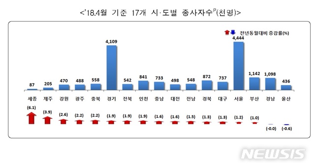 16개 시·도별 임금을 조사한 결과 지난 4월 기준으로 종사자수 증가율이 가장 높은 지역은 세종(6.1%), 제주(3.9%)로 나타났다. 조선업 불황 등의 영향으로 울산은 0.6% 감소했다.