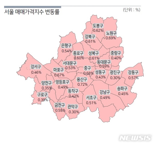 서초(0.51%), 강남(0.49%), 강동(0.57%) 등를 비롯해 영등포구(0.49%), 동작구(0.42%), 양천구(0.35%) 등 모든 구에서 상승폭이 축소됐다.