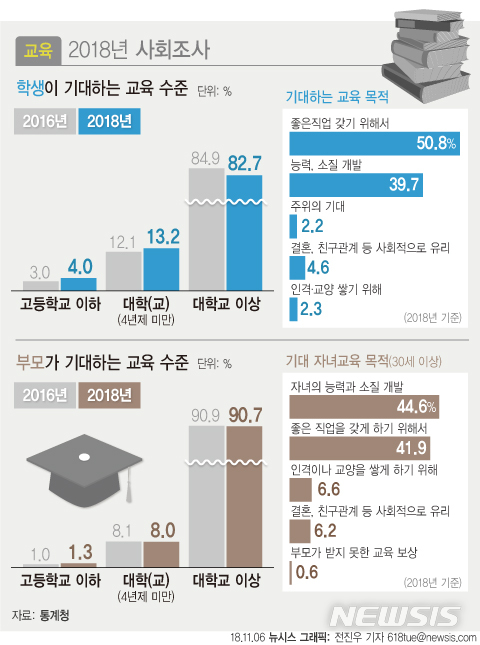 6일 통계청이 발표한 '2018년 사회조사 결과'에 따르면 4년제 대학 이상의 교육 수준을 원하는 학생은 전체의 82.7%로 나타났다. 자녀가 4년제 대학 이상의 교육을 받길 원하는 부모의 비율은 90.7%로 학생보다 높았다. 2년 전 이 비율은 각각 84.9%, 90.9%로 모두 감소했다.