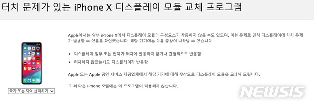 11일 애플코리아는 홈페이지에 '터치 문제가 있는 아이폰X 디스플레이 모듈 교체 프로그램' 공지를 통해 "일부 아이폰X에서 디스플레이 모듈의 구성 요소가 작동하지 않을 수도 있으며, 이런 문제로 인해 디스플레이에 터치 문제가 발생할 수 있음을 확인했다"고 밝혔다.