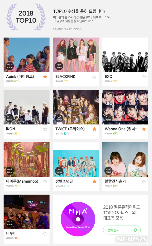 【서울=뉴시스】이국현 기자 = 카카오가 운영하는 뮤직플랫폼 멜론은 '카카오와 함께하는 2018 멜론뮤직어워드(2018 MMA)' 톱10을 공개했다.