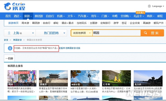 15일 환추왕은 중국 최대 온라인 여행사인 씨트립(셰청·携程)과 퉁청(同程) 등 온라인 여행사들이 전날부터 한국 단체 상품을 판매하고 있다고 전했다.