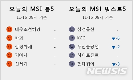 【서울=뉴시스】류병화 기자 = 16일 빅데이터 시장심리지수(MSI)가 가장 높은 '톱5'에 대우조선해양(042660), 한화(000880), 삼성화재(000810), 기아차(000270), 신세계(004170)가 선정됐다.