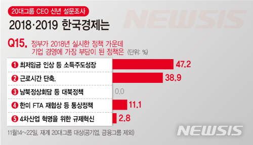 2일 뉴시스가 지난달 실시한 20대 그룹 최고경영자(CEO) 설문조사 결과에 따르면 정부가 올해 실시한 정책 가운데 기업 경영에 가장 부담이 된 정책을 묻는 질문(중복응답)에 최저임금 인상 등 소득주도성장을 지목한 CEO가 17명(47.2%)으로 최다였다.