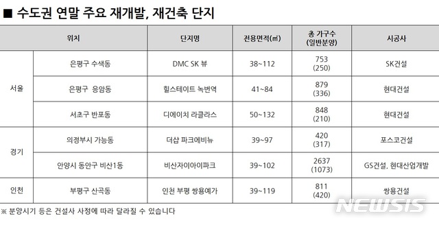 지역별로 보면 서울은 5곳 총 1416가구로, ▲서울시 은평구 수색9 재정비촉진구역 재개발, SK건설 'DMC SK 뷰'(일반 250가구) ▲서초구 삼호가든맨션3차 재건축, 현대건설 '디에이치 라클라스'(일반 210가구) 등이 분양을 앞두고 있다.