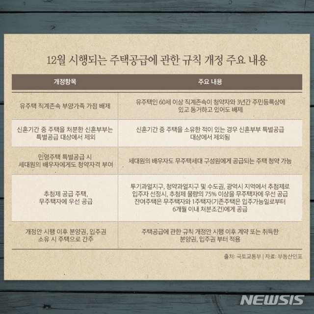 개편된 청약제도는 ▲부양중인 유주택자 직계존속 청약가점 대상 제외 ▲추첨제 물량의 75%이상 무주택자 배정 등을 주요 내용으로 한다.