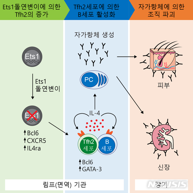 더 나아가 연구진은 Tfh2 세포의 증가가 항체 생성을 촉진하는 인터루킨 4(IL-4) 단백질의 증가와 밀접하게 연관됨을 밝혔다. Ets1 돌연변이가 Thf2 세포의 급격한 증가에 영향을 미치고 이로 인해 건강한 장기를 외부침입자로 인식해 공격하는 자가 항체가 유도되는 과정을 확인한 것이다.