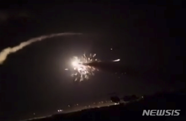 【다마스쿠스= AP/뉴시스】 시리아 공군이 25일(현지시간) 이스라엘 공군에 대항해서 발사한 지대공 미사일. (시리아 SANA통신 제공)