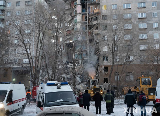 【 모스크바= 신화/뉴시스】차미례 기자 =러시아의 우랄 산맥 서부도시 마그니토고르스크의 10층짜리 주거 빌딩에서 12월 31일 오전 6시께 (현지시간) 가스 폭발이 일어나 일대가 크게 흔들리고 최소 4명이 숨졌다고 러시아 비상재난 당국이 발표했다. 실종된 사람만해도 35명이나 된다.