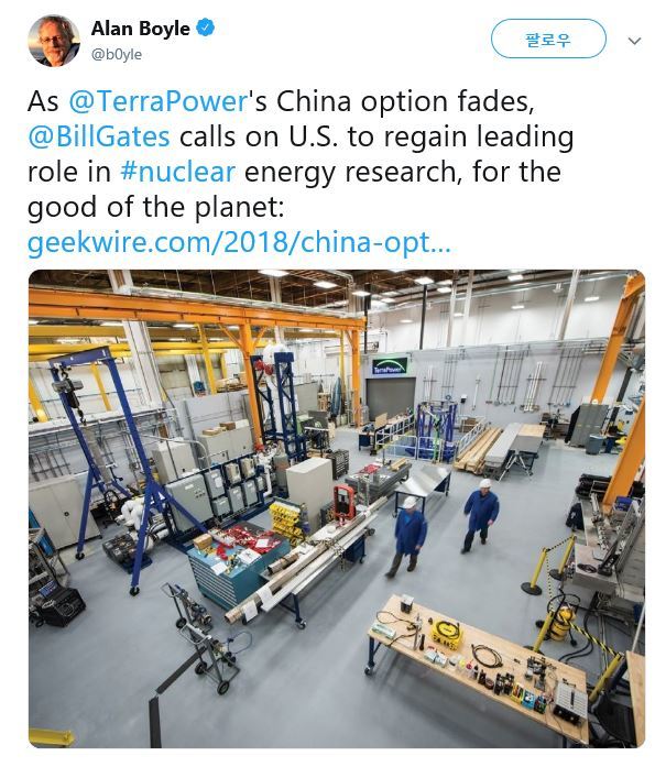 게이츠가 공동설립한 테라파워(TerraPower)사가 지난 3년 동안 중국과 손잡고 추진해왔던 새 원자로 개발 계획이 사실상 무산돼 새로운 파트너를 찾아야 할 상황에 놓여 있기 때문이다.