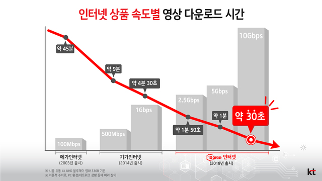 10기가 인터넷은 5GB 용량의 UHD 영화를 4초 만에 다운로드 할 수 있다. 기존 광랜(100Mbps)이 6분 40초, 기가 인터넷(1Gbps)이 40초가 소요된 것과 비교하면 10배 이상 빠른 속도다. 업계에 따르면 1Gbps가 또는 500Mbps 등 기가 인터넷을 사용하는 가구는 55%에, 100Mbps를 사용하는 가구는 45% 수준이다. 10기가 인터넷으로 업그레이드를 하면 1인 미디어, 가상현실(VR) 엔터테인먼트, 8K UHD와 같은 고품질, 대용량 콘텐츠를 마음껏 즐길 수 있다.