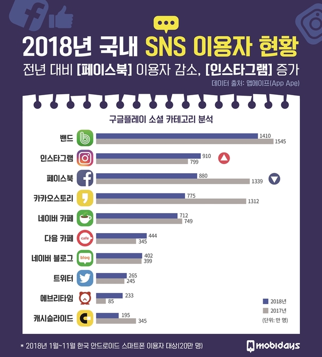 국내 앱 시장 점유율은 밴드(23%), 인스타그램(15%), 페이스북(14%), 카카오스토리(12%), 네이버카페(11%) 등 상위 5개 앱이 시장 전체의 75%를 차지했다.