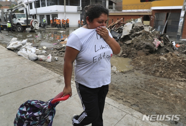【리마(페루)=AP/뉴시스】페루의 수도 리마 시 직원들이 16일(현지시간 ) 하수가 넘쳐 악취가 진동하는 산후안 데 루리간초 구에서 오폐수를 퍼내고 있다.