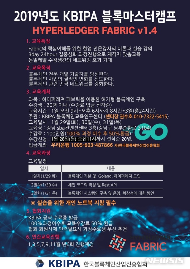 【서울=뉴시스】이종희 기자 = 사단법인 한국블록체인산업진흥협회 산하 블록체인 교육연구센터는 오는 29일부터 사흘간 '2019년 블록마스터 캠프 Hyperledger Fabric v1.4' 전문 교육과정을 개설해 수강생을 모집한다고 21일 밝혔다.