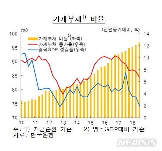 【서울=뉴시스】조현아 기자 = 우리나라 가계부채가 지난해 국내총생산(GDP)의 97%에 육박한 것으로 나타났다. 정부의 각종 규제책으로 증가세가 다소 주춤해지긴 했으나 금융불균형 누적 위험은 여전하다는 지적이다.