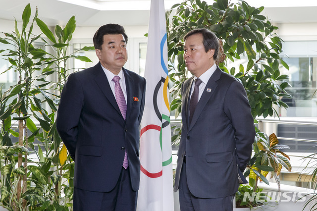 도종환 문화체육관광부 장관과 북한의 김일국 체육상은 15일(한국시간) 스위스 로잔의 국제올림픽위원회(IOC)에서 토마스 바흐 IOC 위원장과 회담을 가졌다.