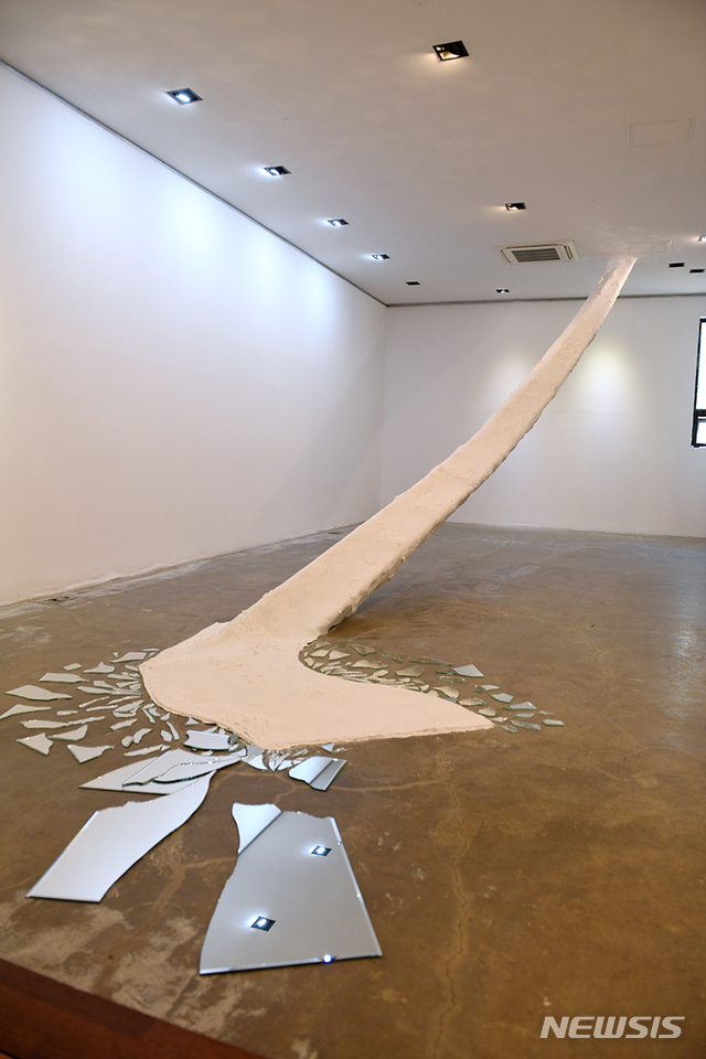 “디지털 시대에 살고 있는 우리는 더 이상 종이에 프린트한 이미지가 아니라 인터넷 검색을 통해 스마트폰이나 모니터 스크린으로 이미지를 많이 보죠. 그러면서 수동적으로 이미지를 받아들이는데 실제로 보는거와는 많이 달라요. 디지털 이미지를 실제로 보면 어떨까 하는 의미의 작업이었어요. 관람객들이 오감을 통해 오브제와 직접적으로 만나기를 바랍니다.” 설치작 1점과 프레임 4점을 전시하는데, 만져도 된다. 겉으로는 단단한 석고, 벽돌 같아 보이지만 만지면 폭신한 스펀지다. 작가는 하나의 매체가 아닌 다양한 방법으로 관객과 소통할 수 있겠다고 생각했다. 사진, 페인팅, 조각, 퍼포먼스, 설치 등 여러 방식으로 효율적인 소통이 이뤄질 때 비로소 재미있는 공간들이 탄생한다고 믿는다.