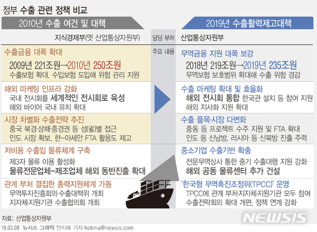 금융 관련 내용은 '수출금융 지원을 250조원까지 늘리겠다(2010년 대책)'에서 '무역금융 지원을 235조원으로 확대하겠다(2019년)'로, 마케팅은 '한국 전시회를 세계 수준으로 육성하겠다'에서 '해외 전시회 참석을 지원하겠다'로 내용 일부만 바뀌었다.