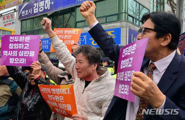 【광주=뉴시스】변재훈 기자 = 전두환(88) 전 대통령이 광주에서 열린 고(故) 조비오 신부 사자명예훼손 재판에 출석한 11일 광주시민들이 항의시위를 벌이며 엄벌을 촉구했다.