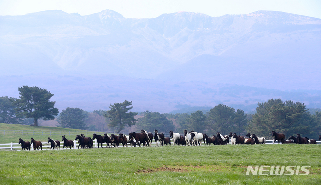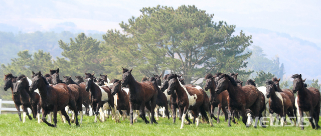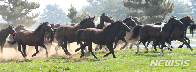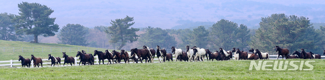 【제주=뉴시스】우장호 기자 = 5일 한국형 승용마로 개량 중인 한라마 100여 마리가 제주 초지로 쏟아져 나왔다.