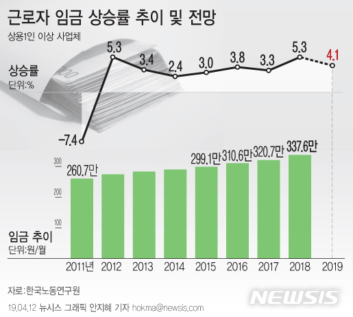 한국노동연구원이 지난 10일 발간한 '2018년 임금동향 및 2019년 임금전망' 보고서를 통해 이 같이 예측했다.