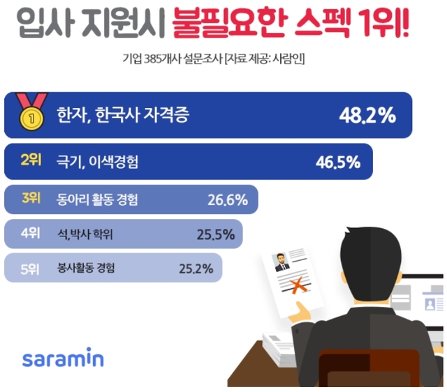 구인구직 매칭 플랫폼 사람인(대표 김용환)이 기업 385개사를 대상으로 ‘채용시 불필요한 스펙’에 대해서 조사한 결과 응답기업의 73.2%가 ‘입사지원서 검토 시 불필요한 스펙이 있다’고 답했다.