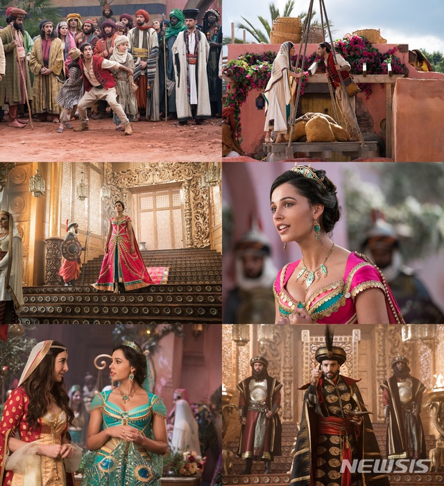 함께 공개된 6종 판타지 스틸은 아그라바 왕국의 거리에서 어린이들을 보호하는 역동적인 알라딘의 모습을 통해 화려한 액션신을 예고한다. 알라딘과 자스민의 사랑의 순간도 확인할 수 있다. 아그라바 왕국의 비주얼, 캐릭터와 높은 외모 싱크로율을 보여준 나오미 스콧(26)의 아름다운 모습과 화려한 의상도 눈에 띈다.