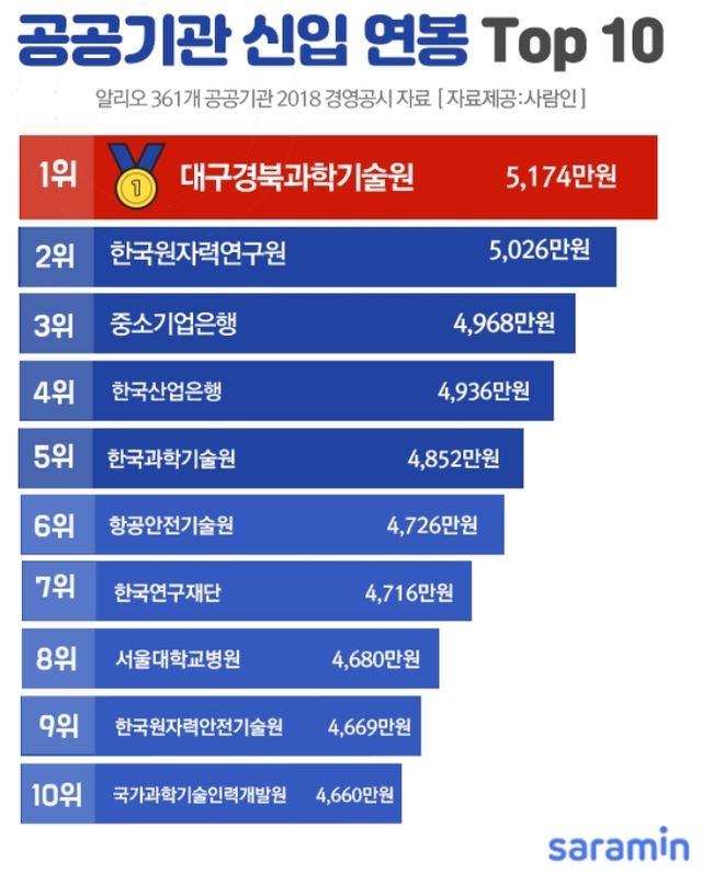 취업포털 사람인(대표 김용환)이 공공기관 경영정보 공개시스템 ‘알리오’에 공시된 361개 공공기관(공기업 36개, 준정부기관 93개, 부설기관 23개, 기타공공기관 209개 포함)의 2018년 경영공시자료를 분석한 결과, 5174만원을 지급한 대구경북과학기술원이 1위를 차지했다.
