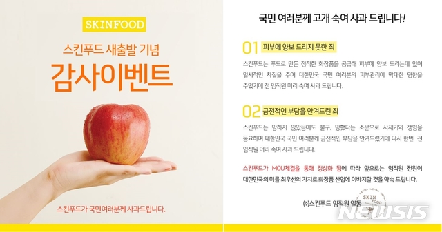 【서울=뉴시스】성민지 기자 = 폐업설이 돌던 국내 1세대 화장품 로드숍 스킨푸드가 '대국민 사과문'을 올리며 정상화 시동을 걸었다.