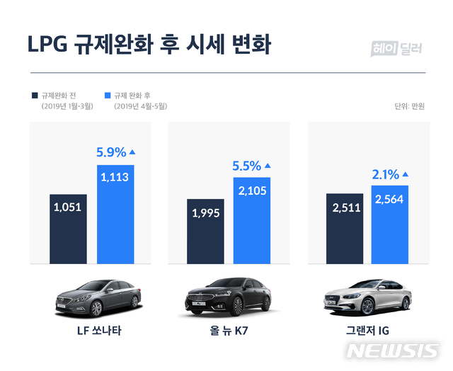 헤이딜러 관계자는 "중고차 시세가 일반적으로 월별 평균 2~3% 하락하는 점을 고려하면, 출고 5년 이내 쏘나타, K7, 그랜저의 LPG중고차의 실질 시세 상승폭은 최대 4~9%로 볼 수 있다"고 설명했다.