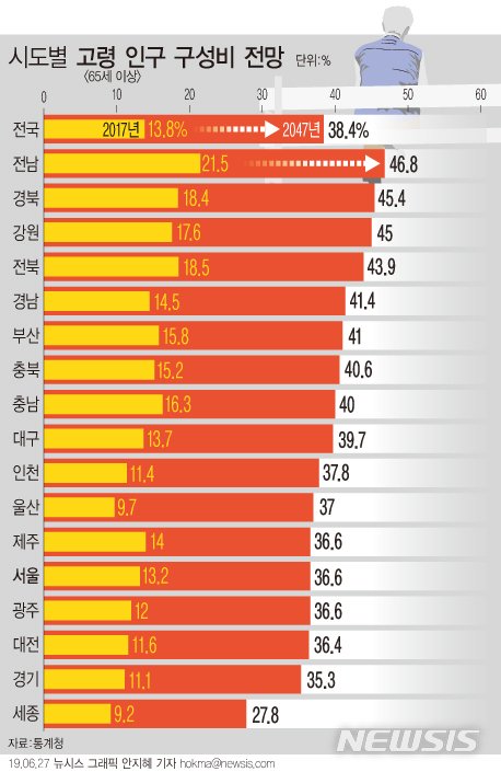 고령인구가 전체 인구에서 차지하는 비중은 전남(46.8%), 경북(45.4%), 강원(45.0%), 전북(43.9%), 경남(41.4%), 부산(41.0%), 충북(40.6%), 충남(40.0%) 등에서 40%를 넘을 것으로 예측됐다. 세종은 이 비율이 27.8%로 전체 시·도 중 가장 낮았지만 2017~2047년 고령인구 증가율은 572.1%(14만명)로 가장 높았다. 고령인구 증가율은 전남(95.9%)을 제외하면 모든 시·도에서 100%를 웃돌았다.