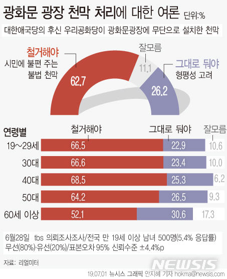 여론조사 전문기관 리얼미터는 지난달 28일 CBS 의뢰로 우리공화당의 광화문 광장 천막 처리에 대한 국민여론조사를 벌인 결과 '시민에 불편을 주는 불법 천막이므로 행정대집행을 통해 철거해야 한다'는 응답이 62.7%로 집계됐다고 1일 밝혔다.