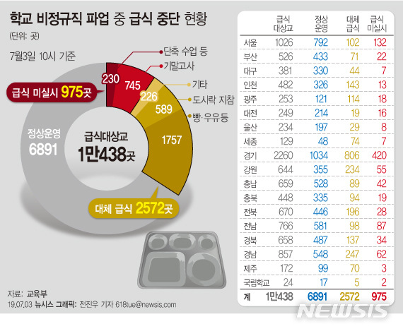 【서울=뉴시스】구무서 기자 = 학교 비정규직 노동자들이 파업에 돌입한 첫날 전국 2802개 학교에서 급식이 정상제공되지 않아 대체급식 등을 실시하거나 단축수업을 했다.
