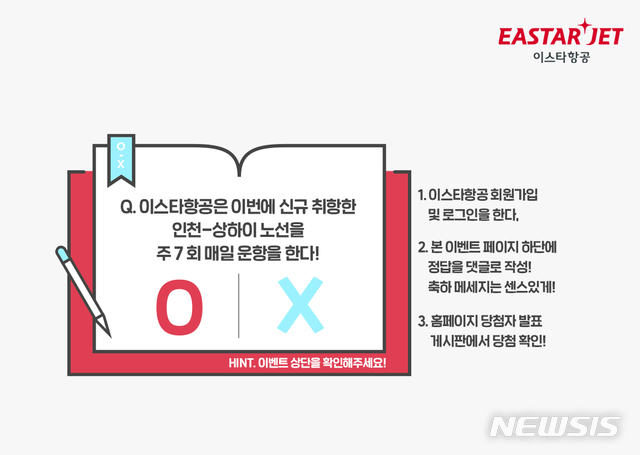 아울러 이스타항공은 OX 퀴즈 댓글 이벤트를 통해 상하이 왕복항공권, 이스타항공 모형 항공기, 커피상품권 등을 증정한다. 이벤트 참여는 이스타항공 홈페이지 로그인 혹은 회원가입 후 이벤트 페이지 하단에 있는 OX퀴즈 정답과 함께 신규취항 축하 메시지를 남기면 응모된다. 당첨자는 홈페이지 당첨자 발표 게시판에 26일 게재된다.