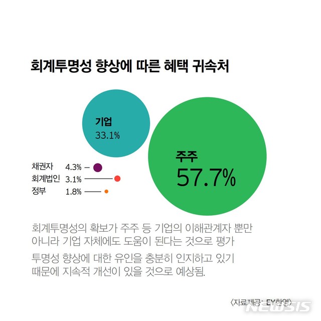 조사 결과에 따르면 '회계 투명성 향상에 따른 이익이 어디로 귀속된다고 생각하는가'라는 질문에 응답자의 57.7%가 주주, 33.1%가 기업에 돌아간다고 답했다. 회계법인을 꼽은 응답자는 3.1%, 조세 당국은 1.8%로 나왔다.