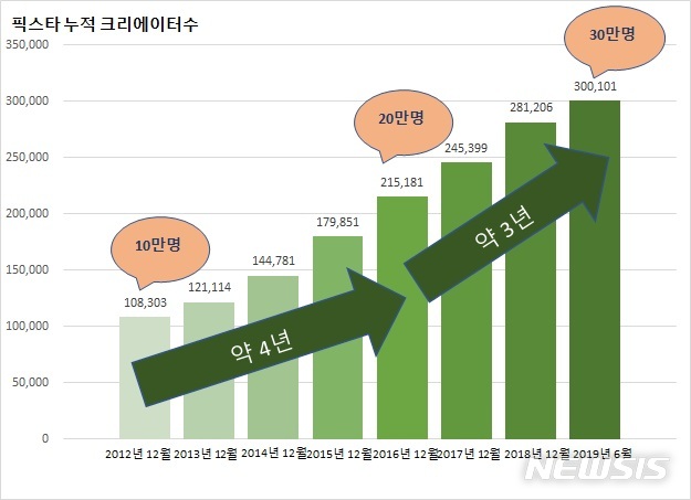 【서울=뉴시스】김진아 기자 = 스톡이미지 마켓플레이스 픽스타(PIXTA)는 자사의 등록 크리에이터 수가 30만명을 돌파했다고 15일 밝혔다. 현재 등록 크리에이터 수는 총 30만1652명이다. 2016년 7월 20만명 돌파 후 약 3년 사이에 신규 크리에이터가 10만명 늘어나 크리에이터 증가 추세가 가속화되고 있다.