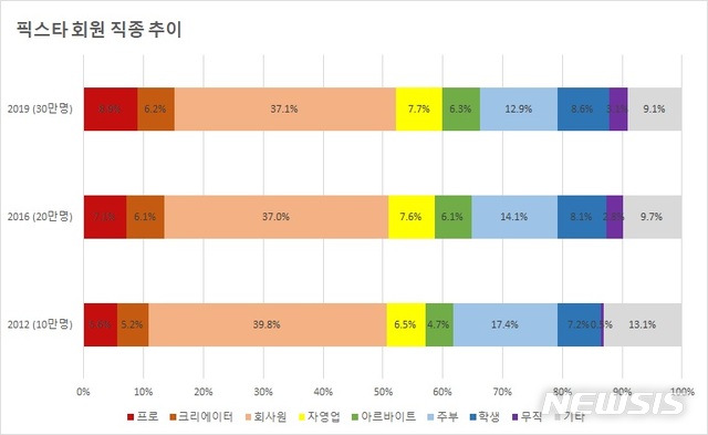 픽스타에 등록한 크리에이터 회원의 직업별 비율도 ‘회사원’이 37.1%로 가장 높게 나타났다. 그 밖에도 회원수가 10만명이었던 2012년과 비교해서 2016년에는 사진, 일러스트레이션, 애니메이션, 동영상 제작자들과 같은 프로 크리에이터들의 가입 비율도 점차 증가했다. 프로 크리에이터들은 안정적인 수입원을 얻고, 원래 하고 싶었던 일을 지속적으로 하기 위해 픽스타를 선택한 것으로 나타났다.